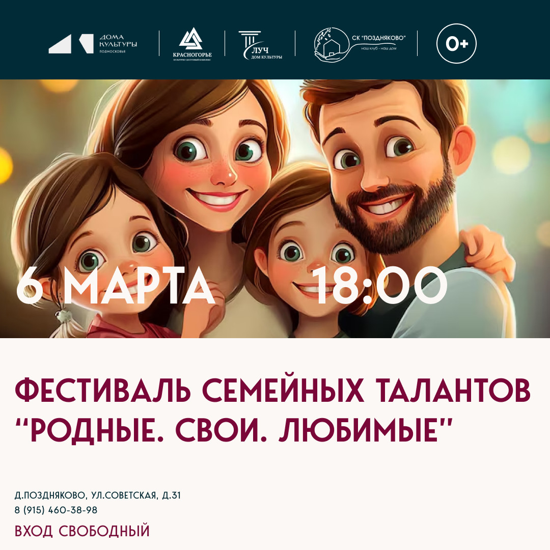 В сельском клубе «Поздняково» пройдет фестиваль семейных талантов «Родные. Свои. Лучшие». Состоится праздничный концерт творческих коллективов художественной самодеятельности. Прекрасный узор из номеров, которые олицетворяют такие ценности - как творчество, любовь к родному дому и родной земле, на сцене сплетут воспитанники хореографической студии ODONATA, вокальной студии "Триумф" и студии музыкальной ритмики Импресс.