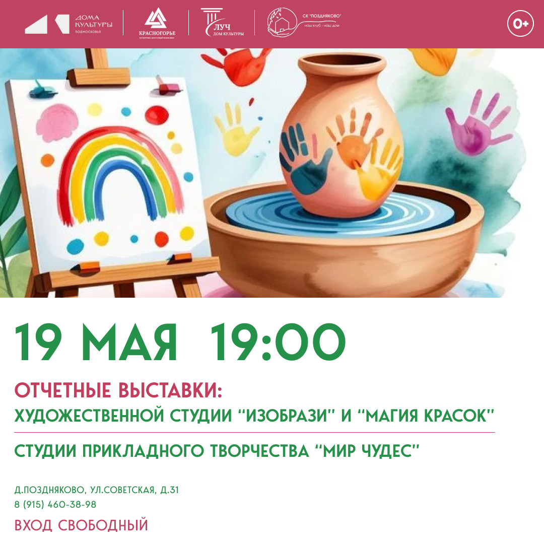 В завершение учебного года в СК "Поздняково" пройдет отчетная выставка художественной студии «Магия Красок» и студии прикладного творчества «Мир чудес». Выставка станет отличным показателем того, чему ребята смогли научиться за прошедший год.