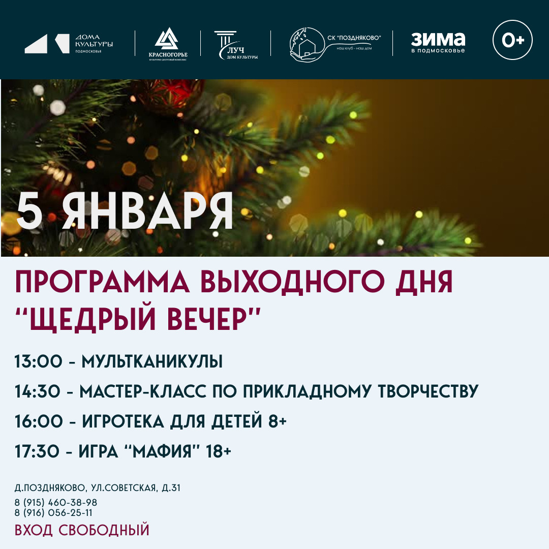 В новогодние каникулы в СК «Поздняково» пройдет увлекательная программа выходного дня под названием «Щедрый вечер», которая подарит всем гостям множество ярких впечатлений.
