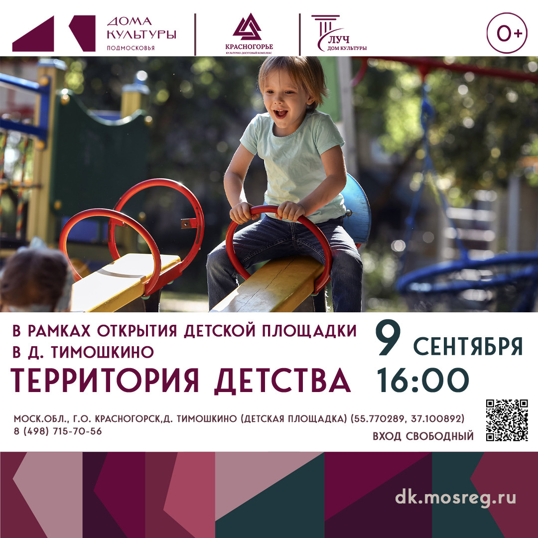 В рамках программы по открытию и реконструкции детских площадок, творческая команда Дома культуры «Луч» организует интерактивно‑развлекательную программу для юных жителей территориального отдела Ильинского «Территория детства». Всех гостей торжественной церемонии ждут подвижные игры и эстафеты, танцевальные флешмобы под заводную музыку, много музыки, смеха и отличного настроения, а также встреча с любимыми героями мультфильма «Фиксики».