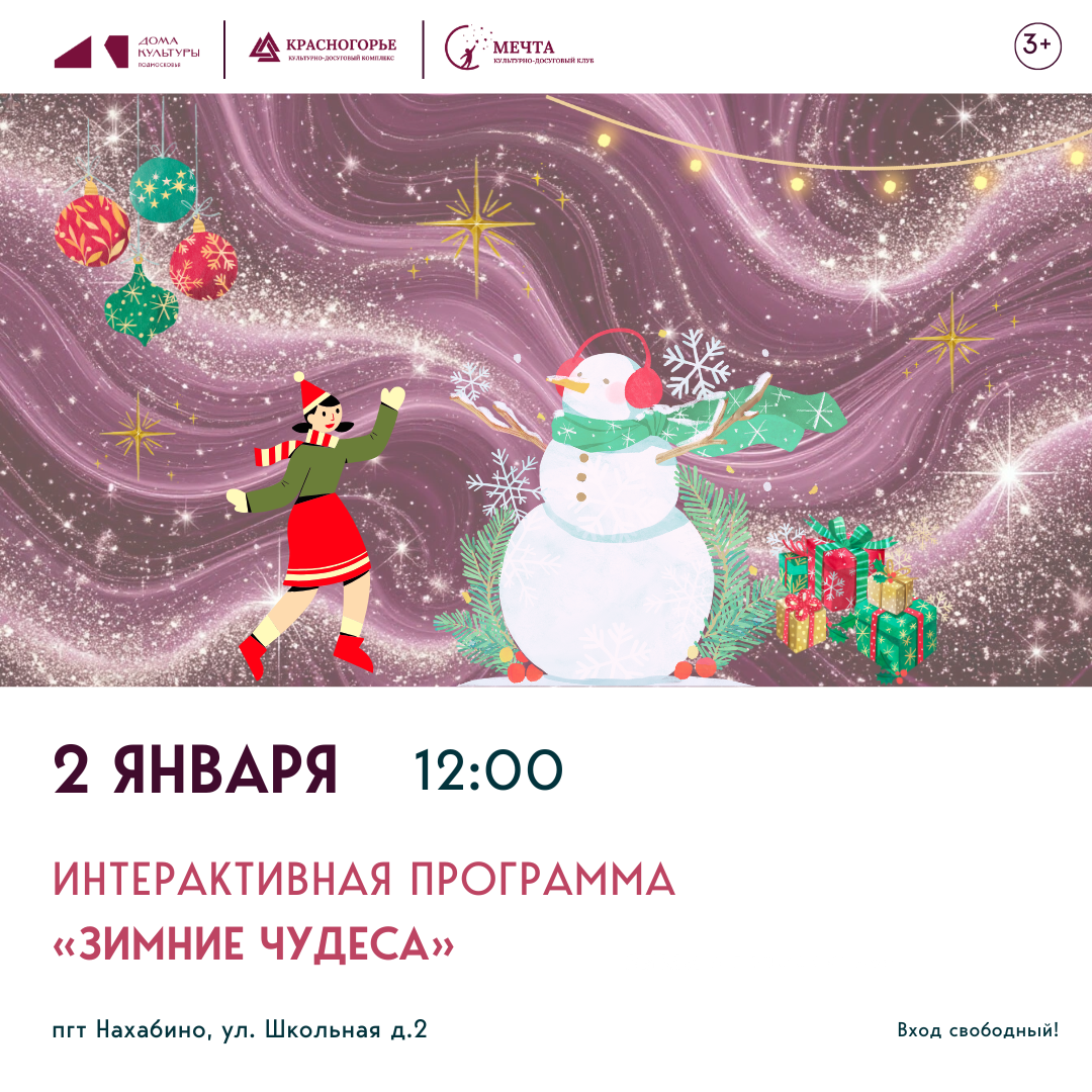 2 января 12:00 Интерактивная программа «Зимние чудеса». Вход свободный! пгт Нахабино, ул. Школьная д.2
